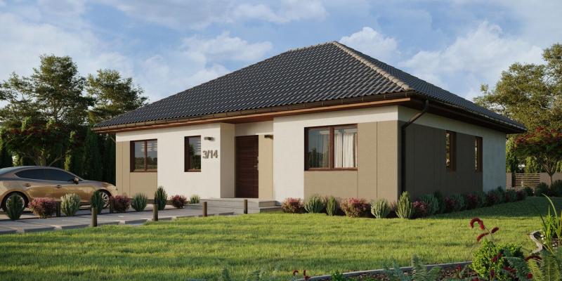 Dom ERDOL 104 to parterowa nieruchomość o powierzchni 104 m², zaprojektowana z myślą o komforcie i funkcjonalności. Charakteryzuje się prostą, ale efektowną bryłą z czterospadowym dachem o kącie nachylenia 30 stopni. Układ wnętrza został starannie przemyślany, aby maksymalnie wykorzystać dostępną przestrzeń, oferując m.in. dwie łazienki, co ułatwia codzienne funkcjonowanie. Dodatkowym atutem jest taras z podcieniem, zapewniający komfort nawet podczas deszczowej pogody.